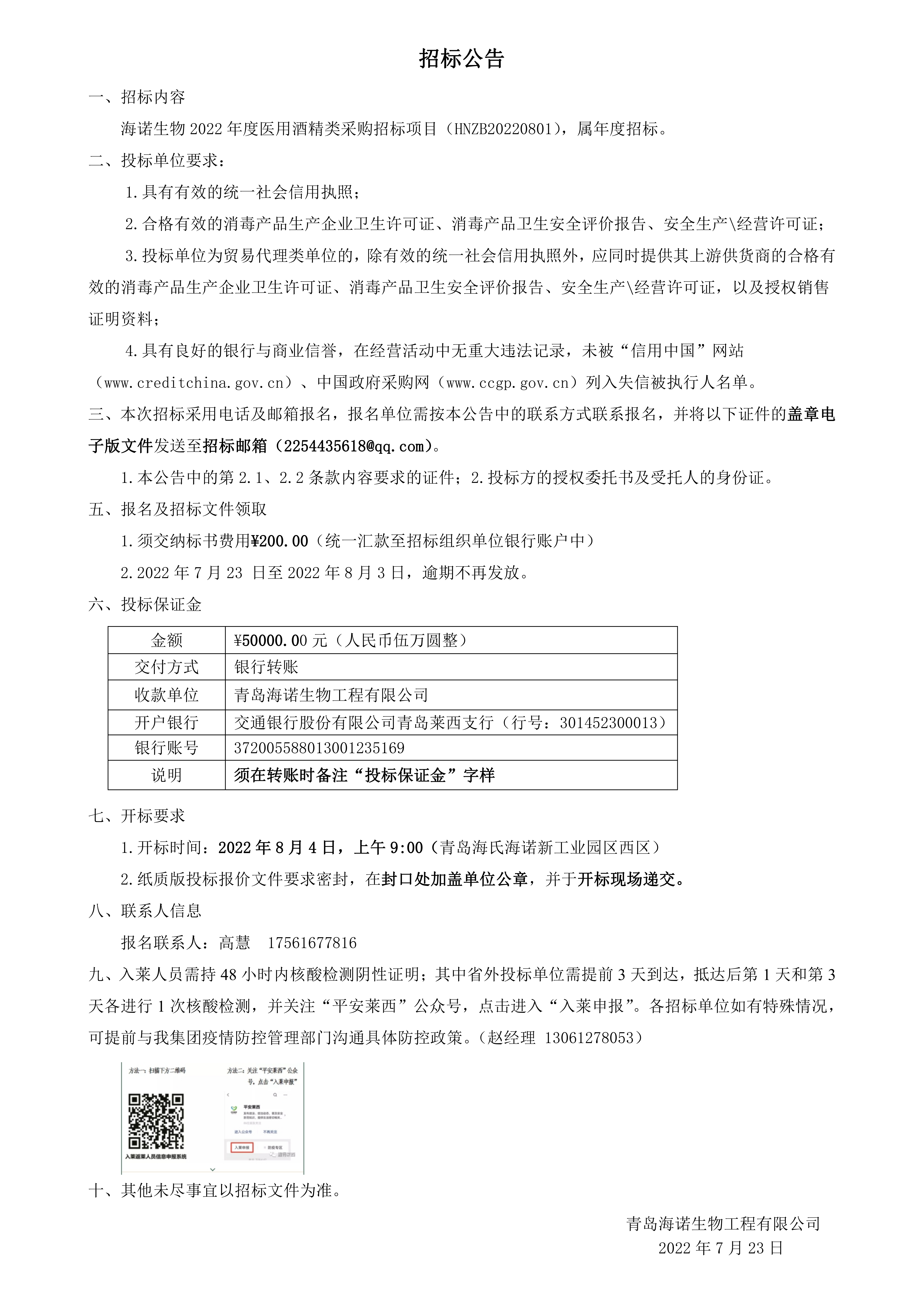2022年度海氏海諾集團酒精類采購招標公告