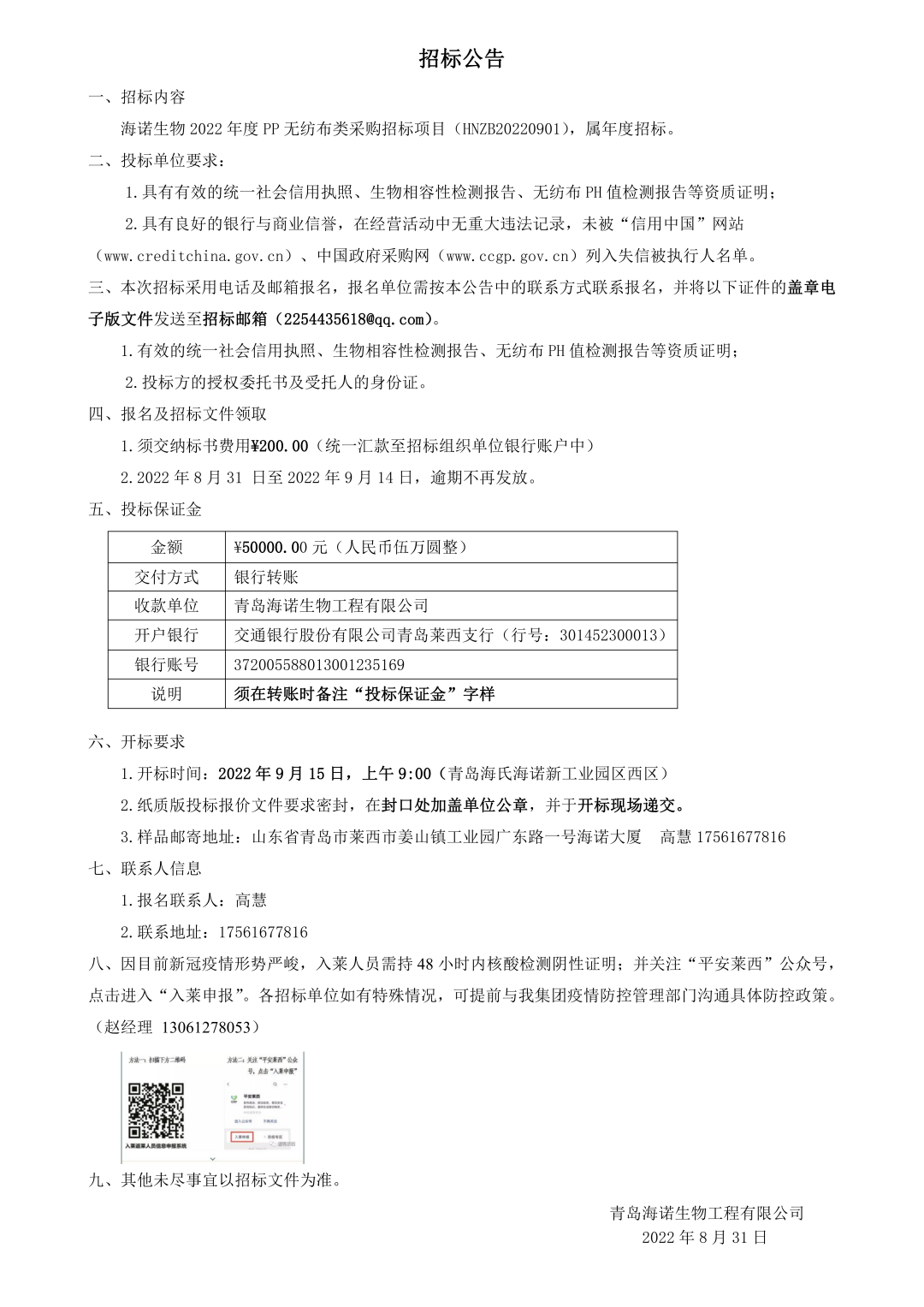 2022年度海諾生物PP無紡布類采購招標正式開始,屆時我們將秉承公正、公平、公開、透明的招標原則,期待優秀供應商的廣泛參與。具體招標細節如下: