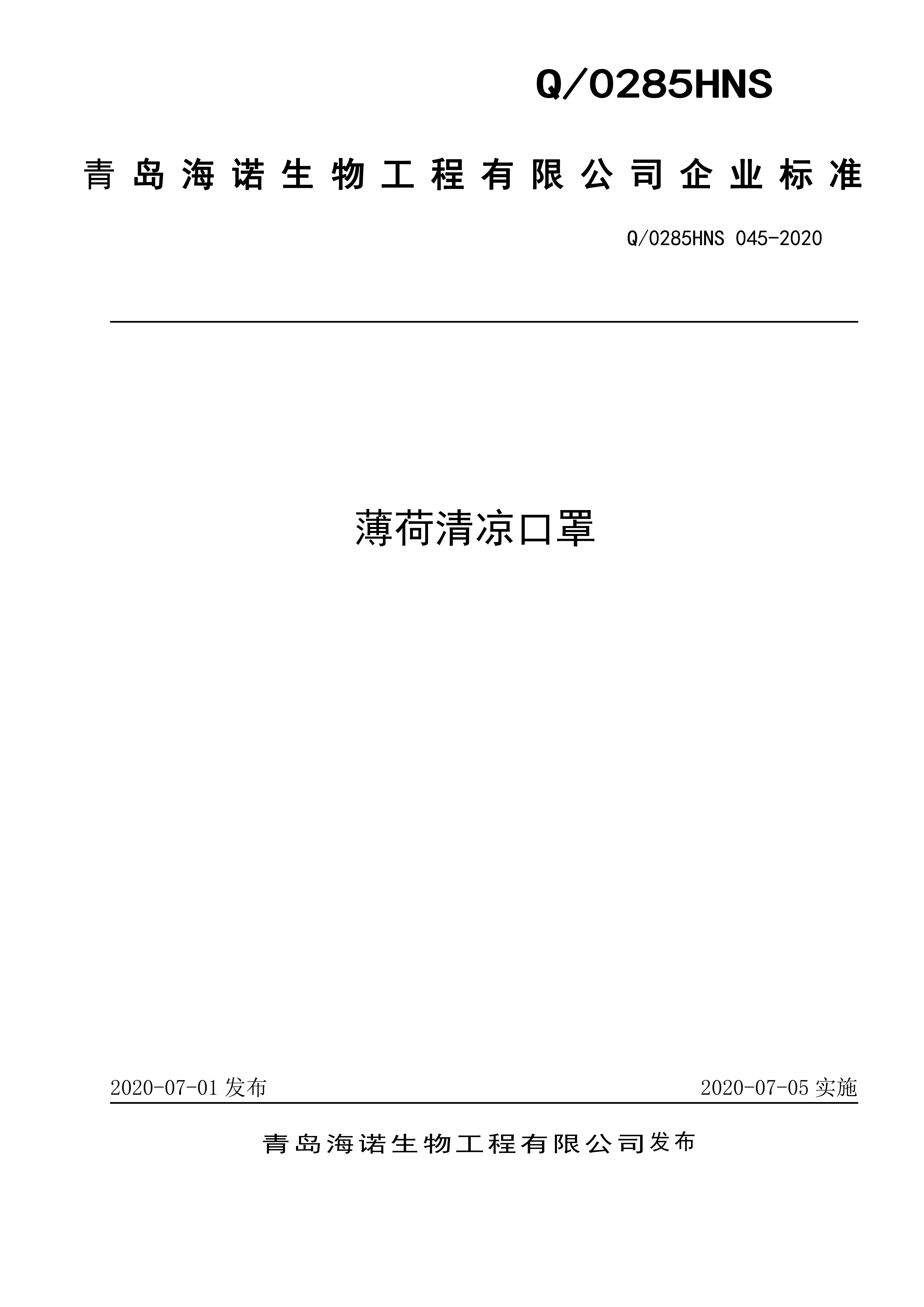 青島海諾生物工程有限公司企業(yè)標(biāo)準(zhǔn) — 薄荷清涼口罩